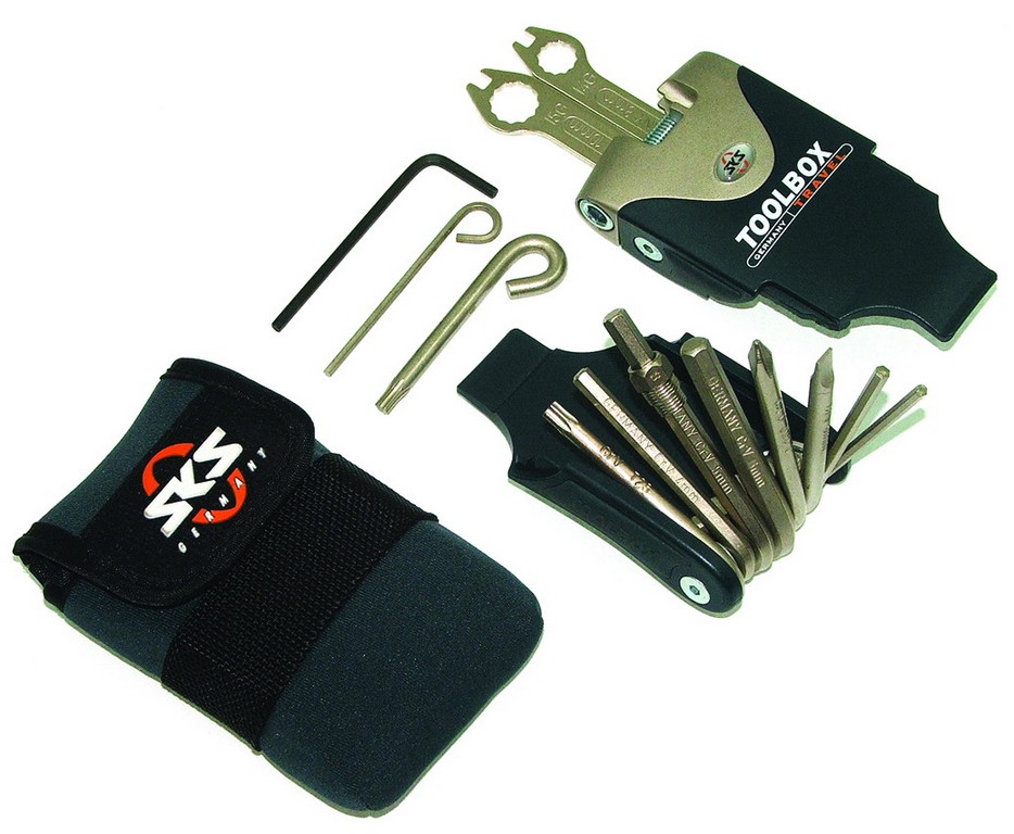 18 funkcija: - imbus 2, 2.5, 3, 4, 5, 6, 8mm - šrafciger X - par Pvc montirača za gume - alat za žbice g14 i g15 - specijalni ključevi za disk Shimano i Magura t20 i t25 - okasti ključevi 8 i 10mm - alat za skidanje lanca desetofaz Materijal: hromvanadijum, težina sa futrolom 223g.