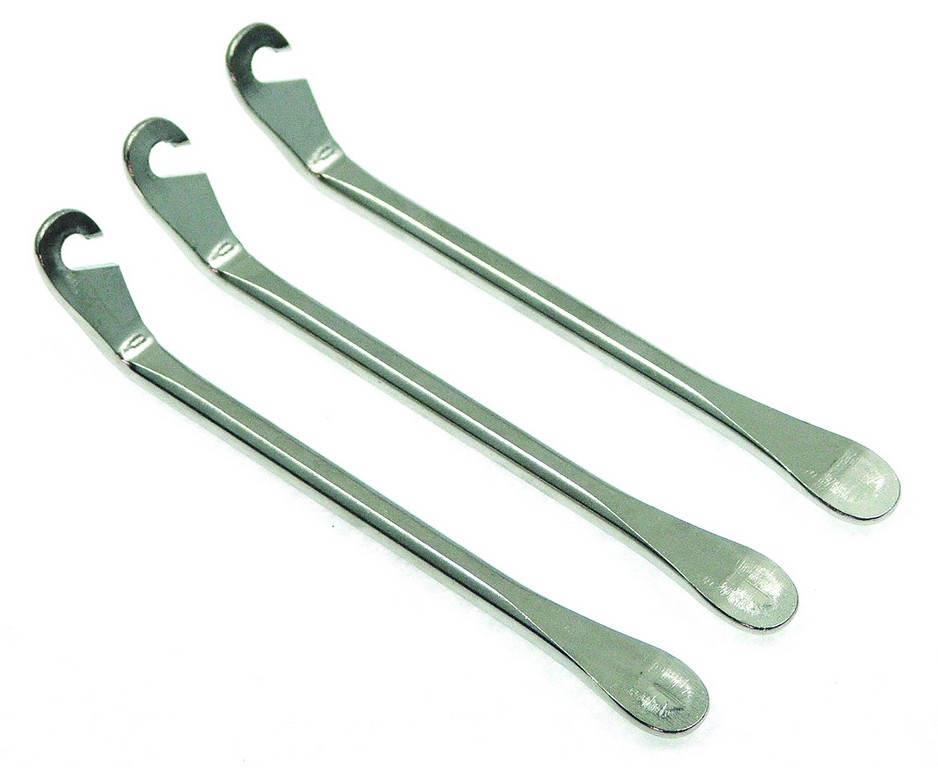 Čelični montirači za spoljne gume bicikle. Jedan kraj montirača se postavlja ispod gume a drugi se zakači za žbice točka.